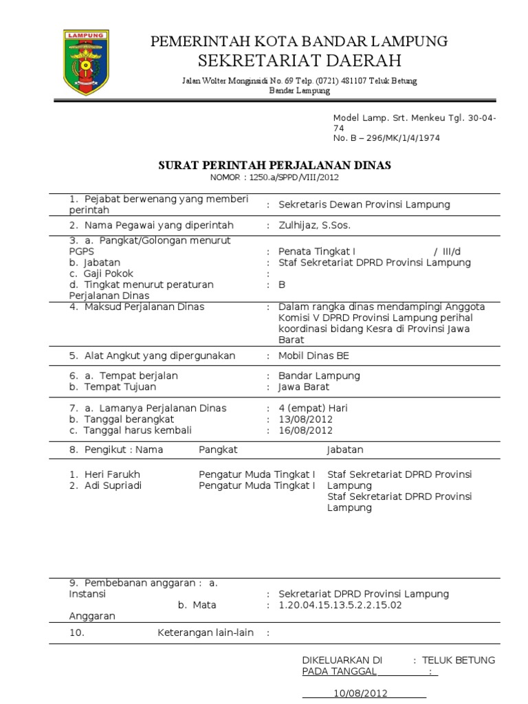 Contoh Surat Perintah Perjalanan Dinas (SPPD) Perangkat ... from 1.bp.blogspot.com Oke deh, sepertinya cukup penjelasannya, cekidot contoh surat perintah perjalanan dinas (sppd) dalam format resmi yang. Surat dinas adalah sebuah surat yang dibuat dengan bahasa formal dari suatu instansi baik berikut beberapa hal yang harus diperhatikan dalam membuat surat perjalanan dinas. Surat dinas adalah surat yang dibuat oleh instansi resmi atau dinas yang berguna untuk berbagai kepentingan tertentu. Surat tugas adalah surat yang berisi penugasan seorang pejabat/pegawai untuk melaksanakan tugas khusus bagi anda yang membutuhkan contoh sppd desa (kepala desa, perangkat, bpd, bumdes, dan lembaga kemasyarakatan desa), sekolah. #contoh surat tugas perjalanan dinas. Selain itu surat perintah perjalanan dinas ini juga berfungsi sebagai bukti perintah dari atasan kepada bawahannya untuk melakukan tugas/pekerjaan di luar kota. Contoh surat lamaran cpns umum 2007. Contoh surat jalan dinas surat tugas perjalanan dinas.
